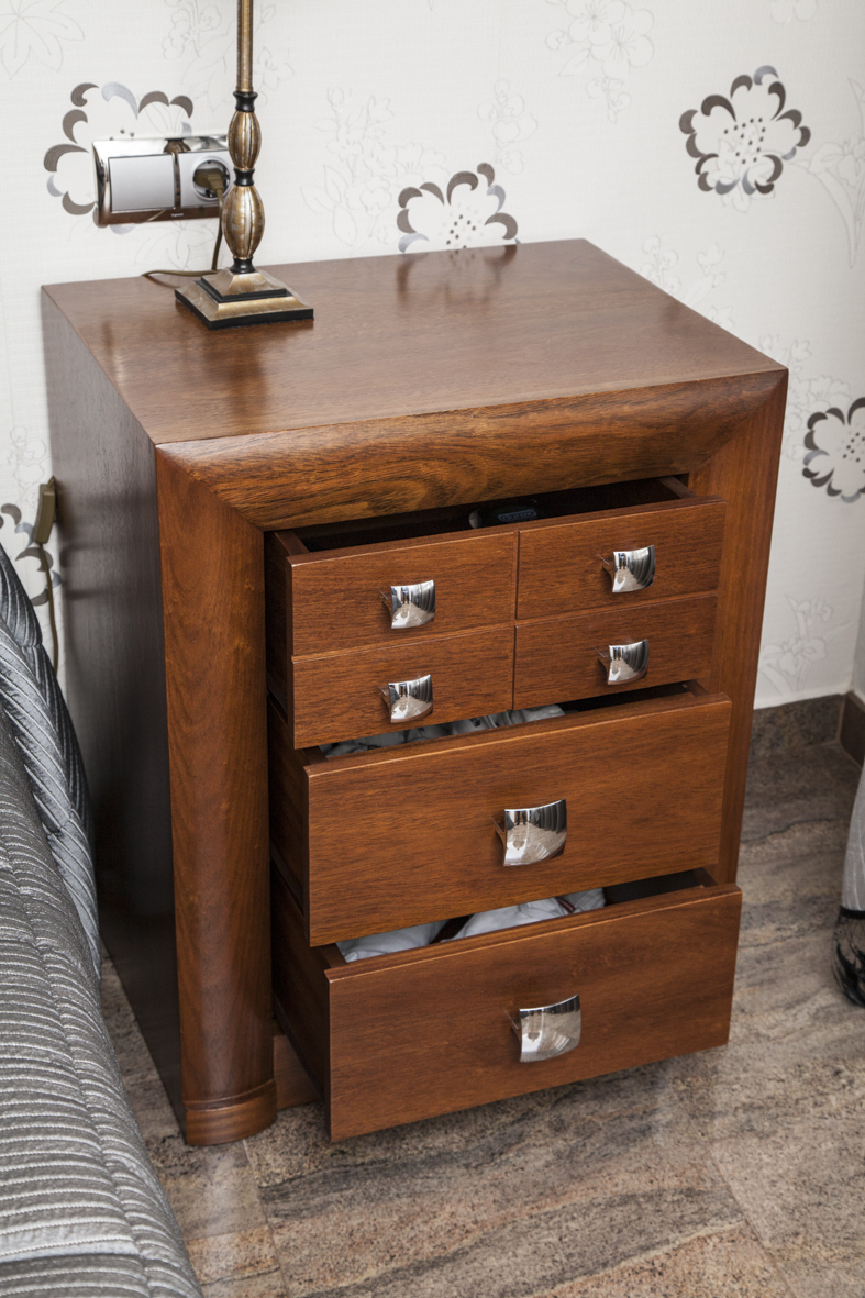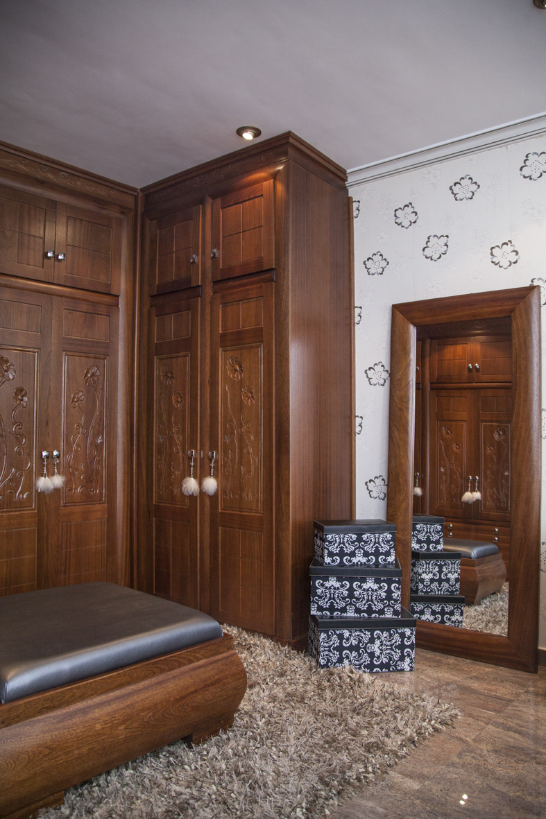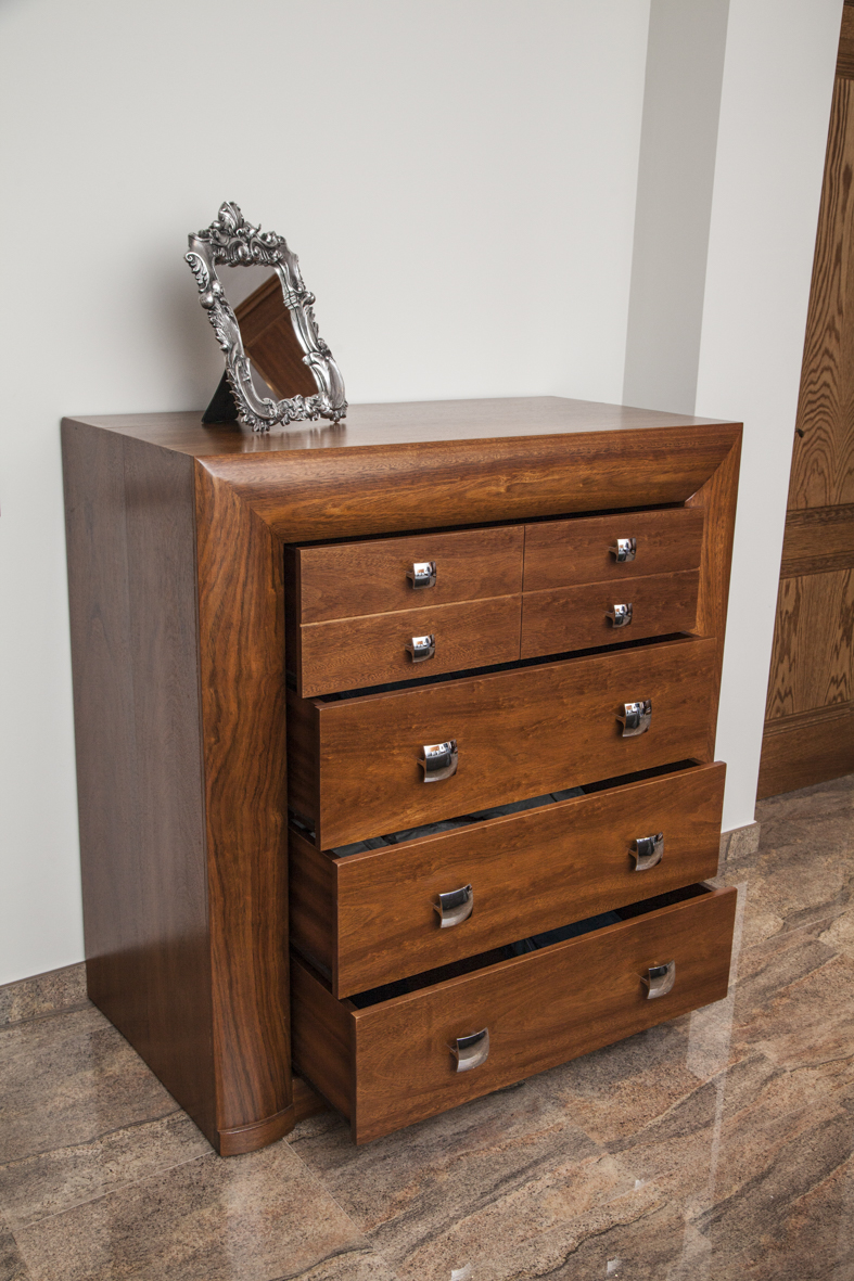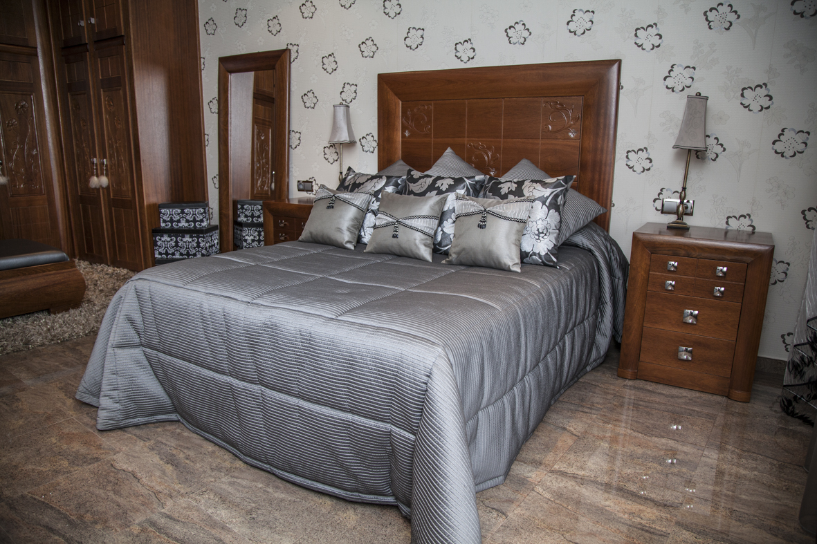 Dormitorio diseñado para soñar con un estilo exclusivo y sin olvidar que está realizado con maderas nobles, mezclando las líneas curvas con las rectas y cuidando cada detalle para que sea perfecto. Conjunto de cabecero, mesitas, cómoda, espejo alto y puff.